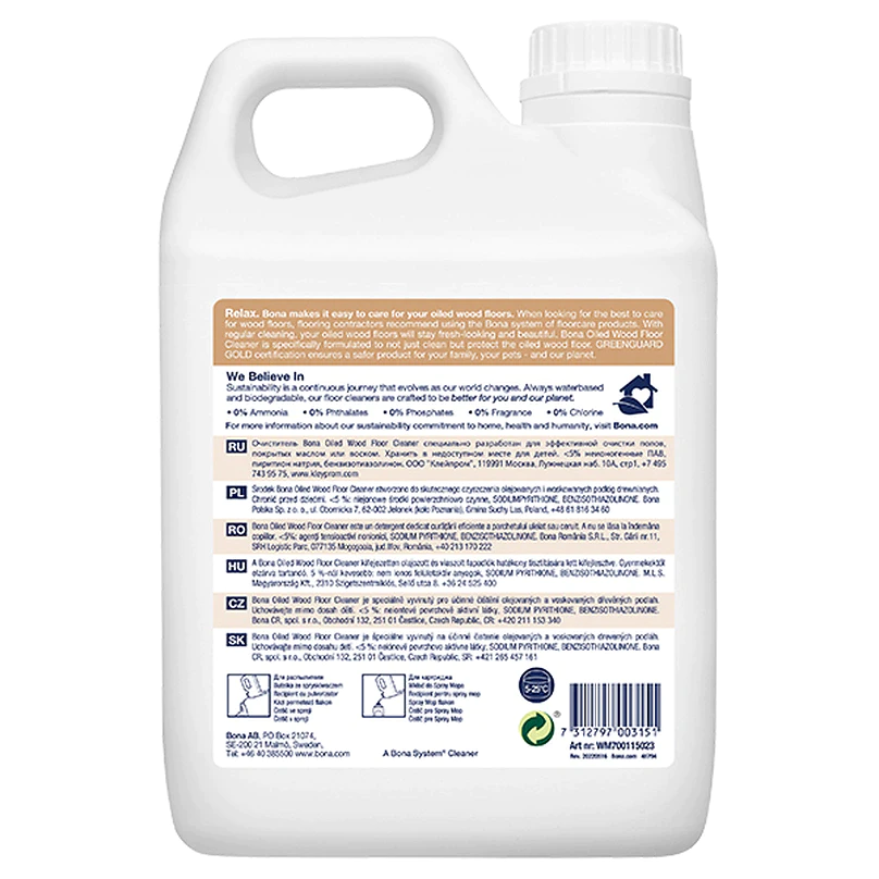 Etichete: detergent parchet uleiat, soluție curățare lemn, Bona Cleaner for Oiled Floors, întreținere podele uleiate, detergent biodegradabil, produs certificat Greenguard GOLD, rezervă detergent Bona, curățare sigură parchet.