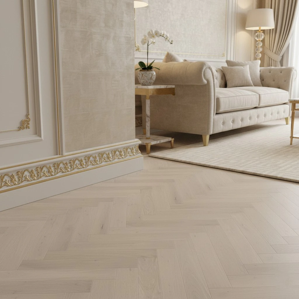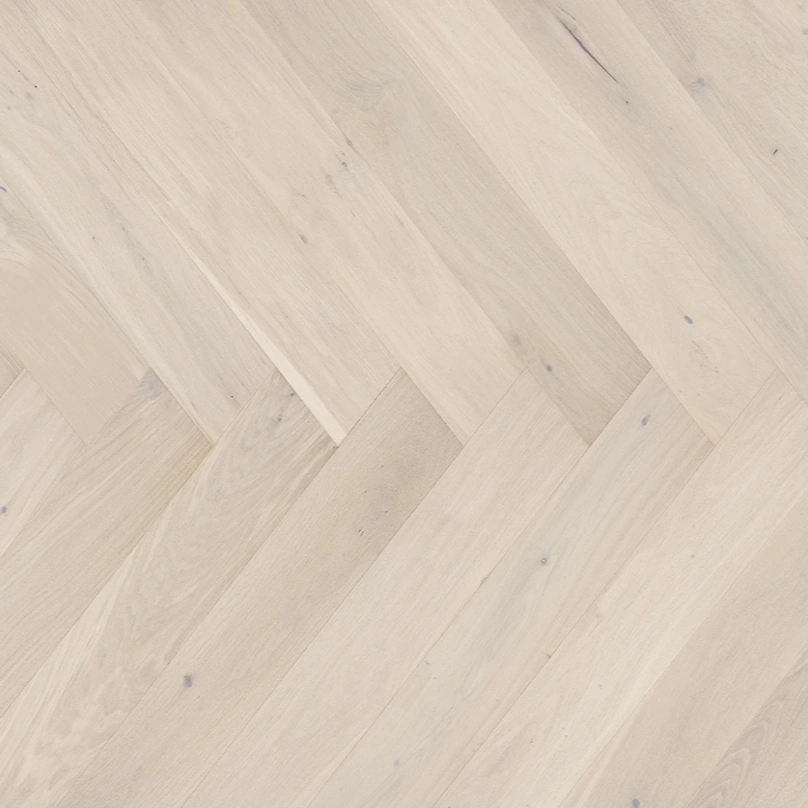 Caracteristici parchet stejar Oak Trivor Herringbone cu finisaj alb-crem delicat