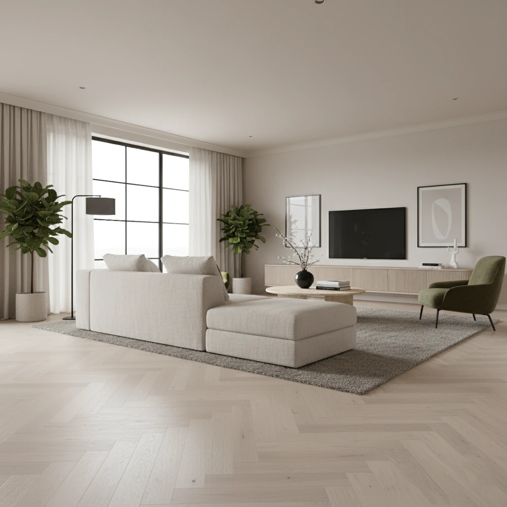În ultimii ani, tendințele în design interior au favorizat tot mai mult materialele naturale și texturile autentice, iar parchetul Trivor se aliniază perfect acestei direcții. Modelul clasic Herringbone (os de pește) este reinterpretat într-o cheie modernă prin culoarea sa deschisă și prin dimensiunile echilibrate ale plăcilor (130 x 725 mm), fiind potrivit atât pentru spații ample, cât și pentru încăperi mai compacte, unde contribuie la crearea unei iluzii de continuitate și lărgime.